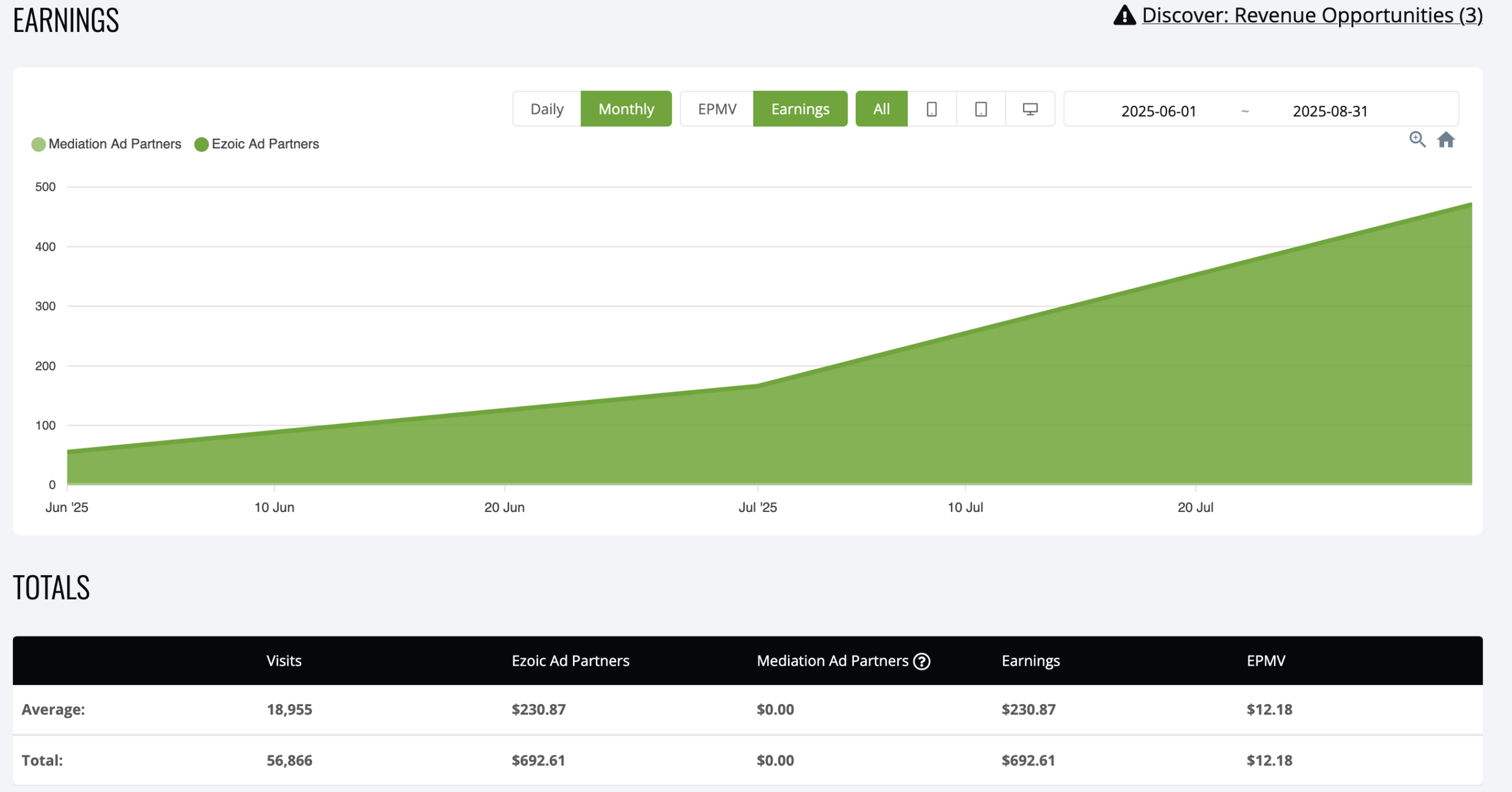 By May 2025, (that’s three months of building traffic via Pinterest), I joined the Ezoic ad network. I made $55 in June via ads and by September, I was making $500-ish a month. 100% of my traffic comes from Pinterest: